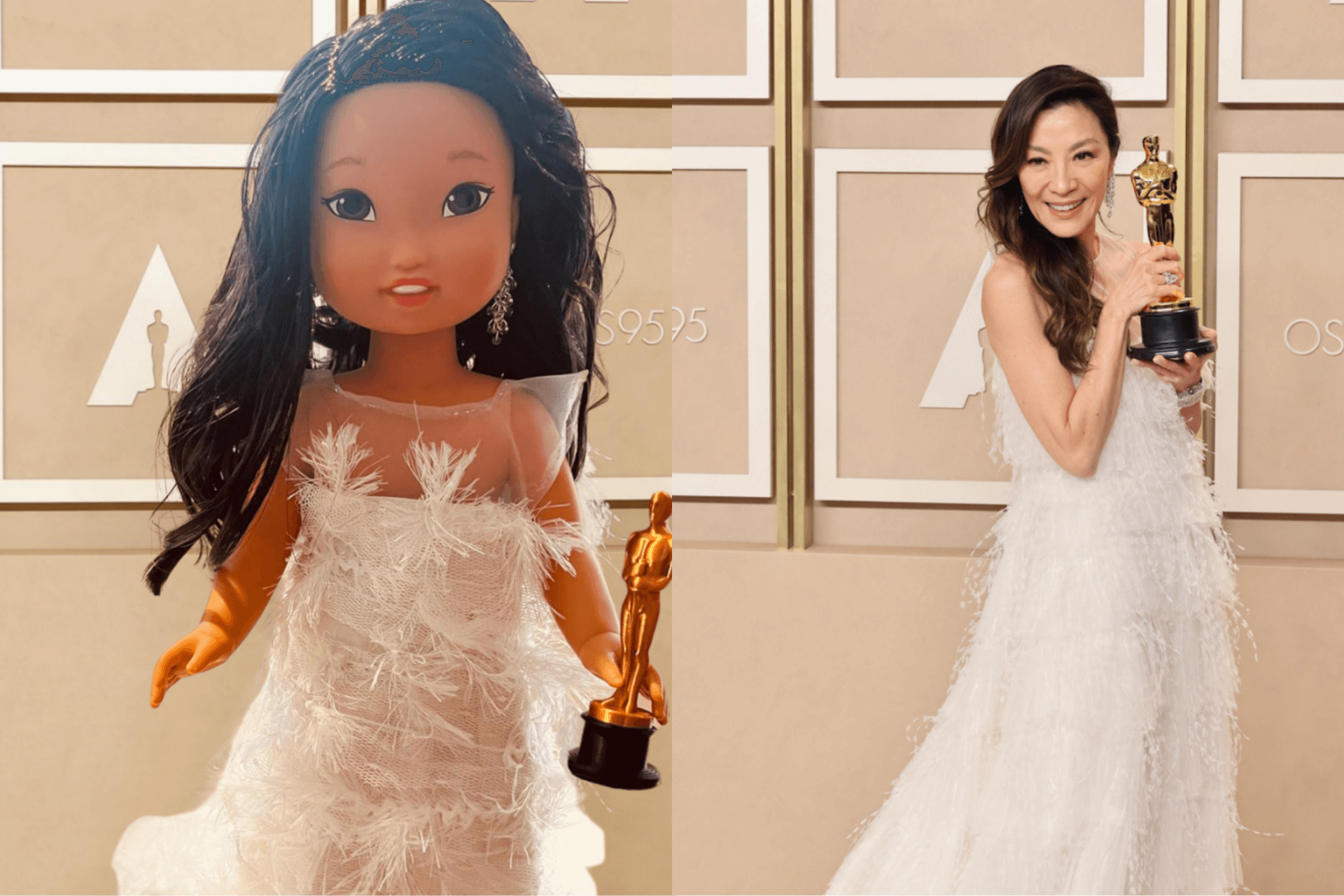 Creating the doll was a careful process that took five months. A professional stylist in Los Angeles helped shape the look, while a supporter in Hong Kong hand sewed the detailed feathery gown. Each part was made slowly and thoughtfully. Everyone involved wanted the doll to reflect Michelle Yeoh’s iconic Oscar moment.